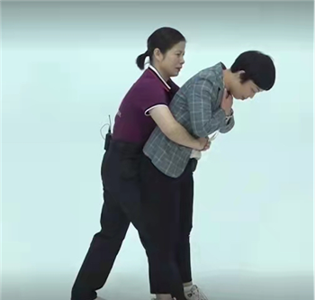 如果异物未排出,急救者站在患者身后,让患者两腿分开,施救者弓步一腿插入患者两腿之间,使其身体略前倾。将双臂分别从患者两腋下前伸并环抱患者。左手握拳,右手从前方握住左手手腕,使左拳虎口贴在患者胸部下方,肚脐上方的上腹部中央,约剑突下两指,形成“合围”之势,然后突然用力收紧双臂,用左拳虎口向患者上腹部内上方猛烈施压,迫使其上腹部下陷。这样每次冲击可将异物从气管内冲出。施压完毕后立即放松手臂,然后再重复。